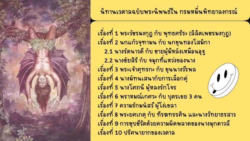 นิทานเวตาล เป็นวรรณกรรมอมตะที่ยังคงความร่วมสมัย แม้จะมีที่มาจากอินเดียโบราณและถูกนำมาแปลและปรับปรุงในหลายยุคสมัย นิทานเรื่องนี้มีลักษณะเป็นนิทานซ้อนนิทาน เล่าเรื่องของเวตาล ปีศาจที่สิงอยู่ในศพ และพระวิกรมทิตย์ที่ต้องตามจับเวตาล โดยระหว่างการเดินทาง เวตาลจะเล่านิทานให้พระวิกรมทิตย์ฟัง เพื่อทดสอบสติปัญญาและคุณธรรมของพระองค์ นิทานเวตาลสะท้อนให้เห็นถึงแง่มุมต่างๆ ของชีวิต ทั้งความรู้ ความฉลาด การใช้ปัญญาในการแก้ปัญหา และความอดทนอดกลั้น
